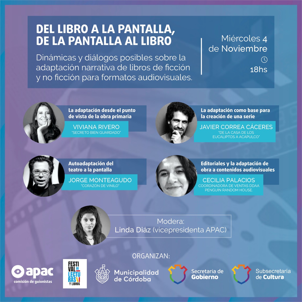 El ciclo «de la pantalla al libro, del libro a la pantalla» se inició en la Feria del Libro de Córdoba 2019. En el año 2020 en el marco de pandemia, presenta una nueva edición, integrando la programación del Festival de Lecturas y Libros (modalidad virtual), organizado por la Municipalidad de la Ciudad de Córdoba.
