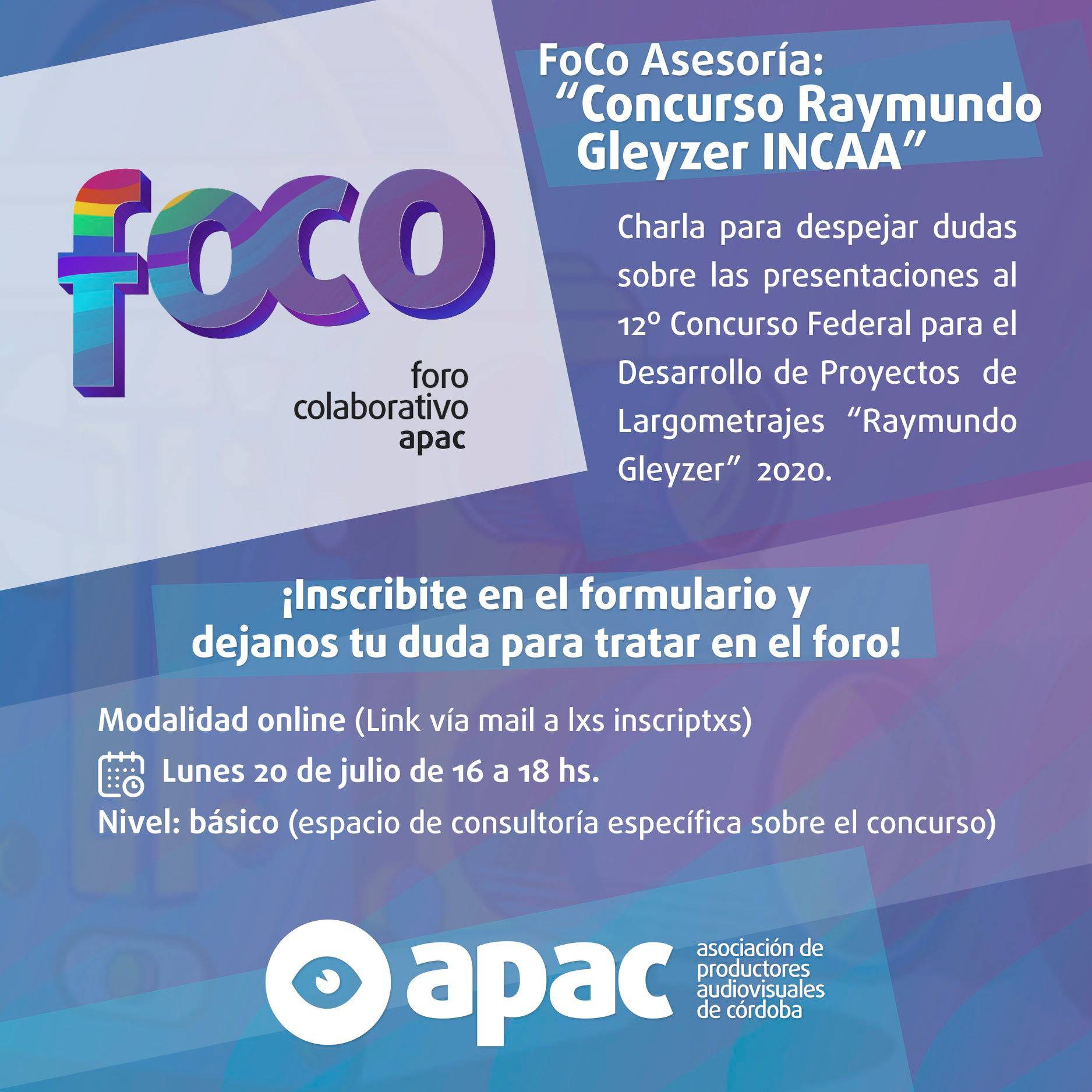 El primer encuentro será FoCo APAC ASESORÍA: «12º Concurso Raymundo Gleyzer 2020».