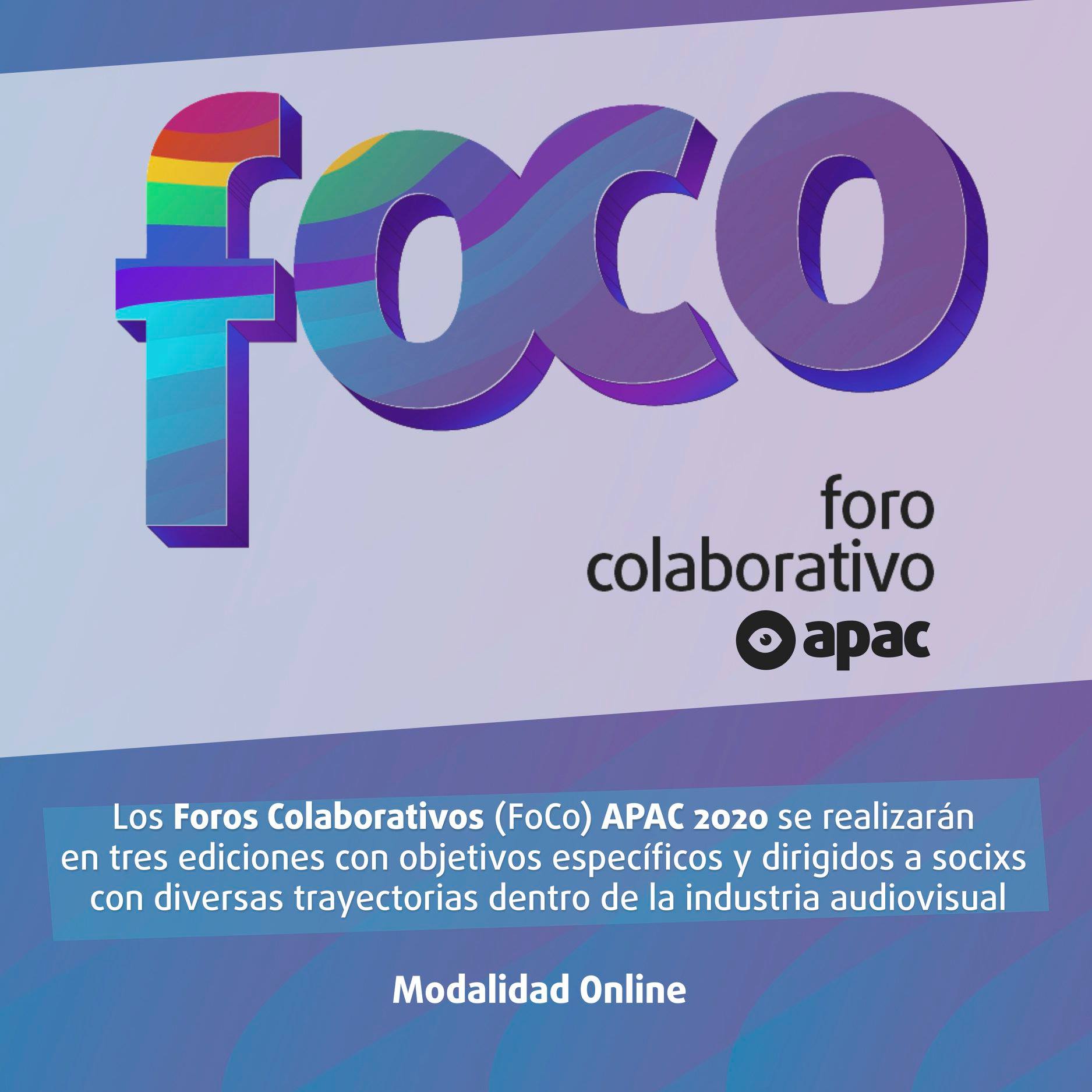 ¡Lanzamos el FORO COLABORATIVO (FoCo) APAC 2020 en modalidad virtual! Una serie de encuentros orientados a la asesoría, la capacitación y el intercambio de experiencias entre socixs APAC de toda la provincia.