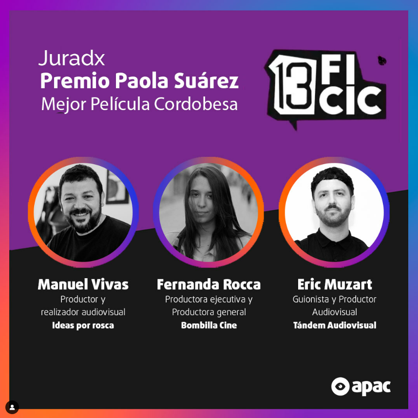 🟣 APAC entregará nuevamente el premio «Paola Suárez» a «Mejor Película Cordobesa», entre las películas que integran la programación del Festival. El juradx está conformado por socixs de APAC, en esta edición son Manuel Vivas Fernanda Rocca y Eric Muzart.